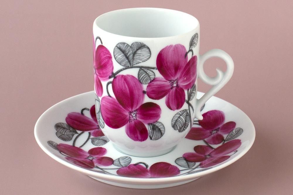 転写プリントによる繊細な濃いグレーの線描で花の茎と葉を描き、その上からハンドペイントで赤紫の花びらを彩色しています。機械的ではなく、一筆ごとに職人の手の動きが感じられる、柔らかい表情が魅力です。
